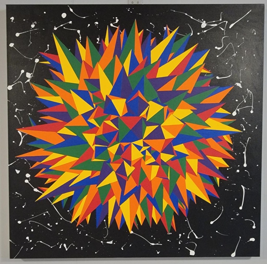 A spiky ball painted with bright, bold colors gives an image of a star in space