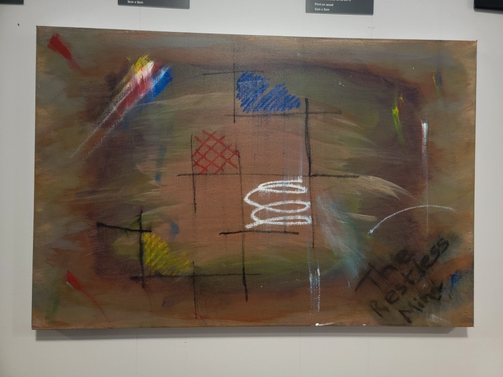 The foreground in oil shows a reference to De Stijl paintings. The normally perfect straight lines and solid colors are represented incomplete, wrong, and imperfect, much like the ideas of the restless mind. The Restless Mind is written in faded oil in the corner to give context and to further represent the incompleteness of thoughts in the state. Other colors shoot across the canvas to show the speed of thoughts going in and out.