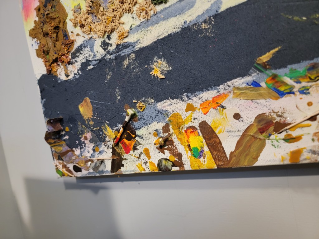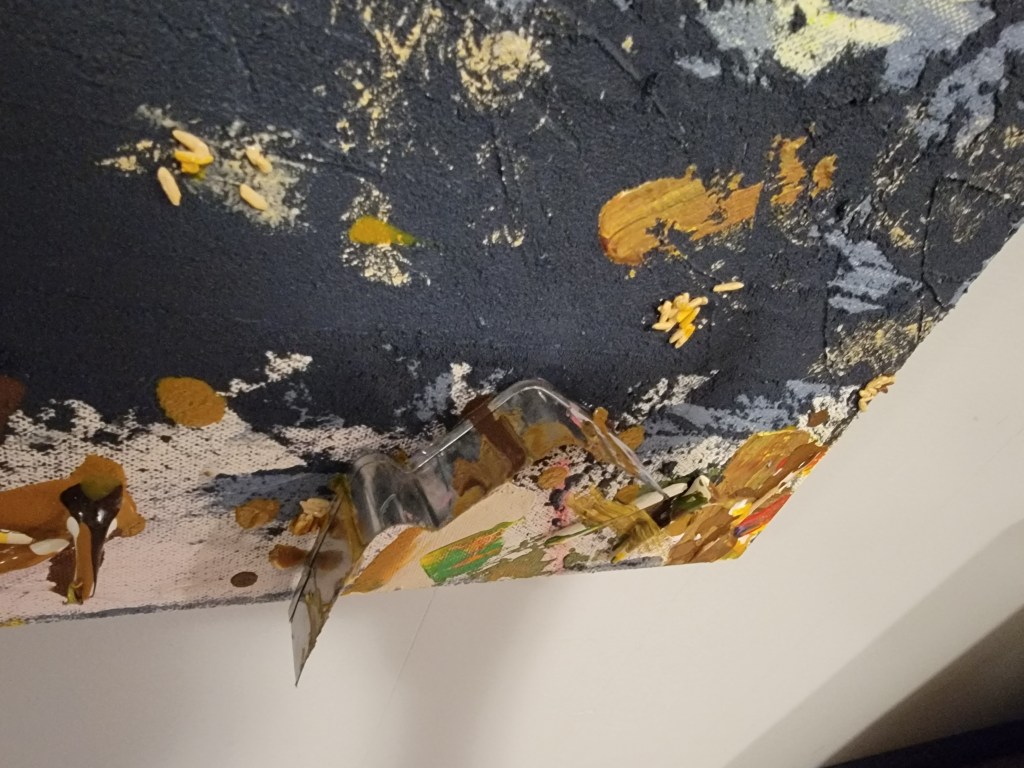 Multimedia on canvas (acrylic, oil, stucco, rice, quinoa, a cookie cutter, golf tees, plastic trash)